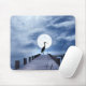 This mouse pad features a silhouette of a heron standing on a pier in front of a full moon. *