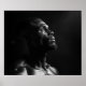 Black and white photograph of a black man's face side-lit in silhouette taken in a dark studio.