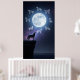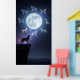 Silhouette of a husky howling on a cliff under a huge full moon revealing the constellations