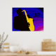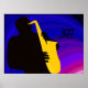 A silhouette of a saxophone player, playing jazz. Blue and purple curves on the background with the word "Jazz" For true saxophone and Jazz lovers!