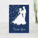Wedding thank you cards with a navy blue and white silhouette picture of a bridge and groom standing by the church door with flowers. This stationery is perfect for a navy blue themed wedding.