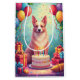 A cheerful birthday scene featuring a Silken Windhound enjoying a festive celebration surrounded by colourful balloons, presents, and a bright birthday cake. The flowing coat and graceful look create a joyful design full of charm and elegance.