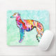 Colourful silken windhound silhouette, outlined in black, on a pale green and blue textured background.