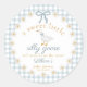 Add the sweetest finishing touch to your celebration with this Sweet Little Silly Goose Will Soon Be on the Loose round sticker. Designed with a soft blue gingham background, a charming white silly goose, and a coquettish blue bow, this personalized baby shower sticker brings a whimsical and polished detail to your baby boy or gender neutral shower decor.
