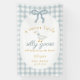 Welcome guests in the sweetest way with this Silly Goose Is on the Loose baby shower banner, featuring classic blue gingham plaid, an adorable white goose wearing a soft blue bow, and a cheerful A Sweet Little Silly Goose Will Soon Be On The Loose saying. Designed to set the tone for a charming, storybook inspired celebration, this sign adds the perfect touch of whimsy to your baby boy or gender neutral shower decor.