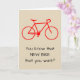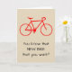 This silly bike themed birthday card features the message "You know that NEW BIKE that you want?" and a red silhouette representation of a bicycle on the front. The inside features the joking message "I really hope that somebody else buys it for you! Happy Birthday!".