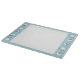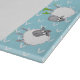 A fun Glass Cutting Board with a border of comic Silly Sheep on a Powder Blue background, dotted with white 'stitches' for an extra woolly look!