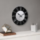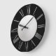 This elegant and glamourous wall clock features a simple black and silver theme. The centre features a faux metallic style silver foil. The outer frame is a solid black. The hours are printed as Roman numerals in a shiny looking gold foil.