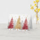 A charming forest scene with silver and gold Christmas trees set against a white backdrop. Sparkling snowflakes add a touch of magic to this elegant holiday design.