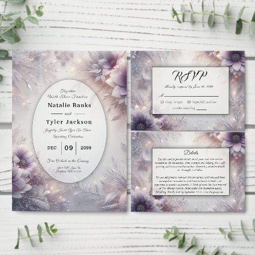 Celebrate your love with the enchanting elegance of winter. This wedding invitation features a dreamy blend of silver accents and soft amethyst blooms, delicately dusted with sparkling frost. Ethereal florals and shimmering snowflakes frame your wedding details with timeless sophistication, creating a romantic winter wonderland vibe. Perfect for winter weddings.
