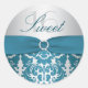 This 1.5" round silver and teal damask Sweet 16 sticker/envelope seal matches the invitation and other items shown below. Other shapes and sizes are also available.