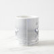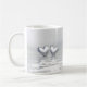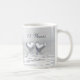 Coffee mug with my simple but pretty silver-coloured artwork of two silver hearts floating on water. Customisable text says "25 Years".