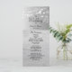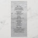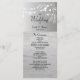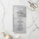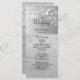 Elegant, modern boho, rustic wood black and white wedding program with vintage silver floral lace and string lights.