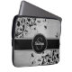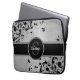 Girly Silver Black Floral Swirls Personalised Laptop Sleeve. Fun, yet professional, this Personalised Silver Brushed Steel photo and Black floral swirls pattern is PRINTED ON A CLOTH laptop sleeve. Make a fashion statement with your monogram initial and name on a circular tag with a black line on a floral swirls pattern and a solid silver background.