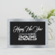 Greeting wish card Happy New Year written in English in white font with golden sound wave on a silver and black background - editable text and background