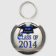 Elegant, cool and classy, "Class of 2014" graduation key chain. "Class Of 2014" in a blue colour text graphic design on a white 3d look background and a matching silver border (printed, not real silver) all around. Added to this key chain is a black graduation cap with a gold tassel. Remember the special day with this custom, classy graduation key chain. Rich looking, yet affordable! Easily customise with the graduate's name or the school name for a great keepsake gift and favour for the whole graduating class!