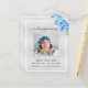 An elegant 2-page program. A faux silver background, a white frame, blue forget-me-not florals and space for a photo. Personalise and add name, dates and your text.