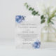 Faux silver looking background decorated with blue florals and faux glitter, sparkles. Personalise and add your names and wedding details. Black coloured letters.
