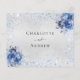 A faux silver metallic looking background, decorated with sparkling light blue faux glitter sparkles and blue florals, flowers. Personalise and add the reply by date and your names.