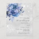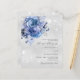 Faux silver looking background decorated with blue florals and faux glitter sparkles. Personalise and add your names and wedding details. Black coloured letters.
