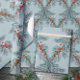 An elegant, sophisticated and festive holiday wrapping paper featuring blue spruce branches and red ilex berries in lattice formation on a dusty blue colour background.