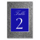 Simple, modern calligraphy script, elegant glitter silver and royal blue table number.