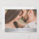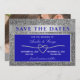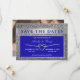 Modern, simple calligraphy script, elegant royal blue and silver glitter Wedding Save The Date invitation with two dates and picture of the couple.