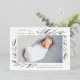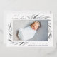 Elegant botanical birth announcement in chic pastel colours features a single full bleed horizontal or landscape orientated photo with clusters of delicate pale grey watercolor leaves at the corners, accented with silver foil. Personalise with baby's name, birth stats, and a personal message, and add three additional square photos to the back.