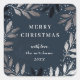 An elegant holiday gift tag featuring hand drawn pine branches in a festive silver and navy blue colour palette designed by Stacey Meacham.