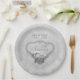 Lovely silver grey Calla Lily paper plates with floral damask background for a 25th wedding anniversary. Elegant silver banner is accented with two Calla Lilies and has text art saying 25th Anniversary in ornate script. Upper text is ready for you to customise with the names and anniversary dates.