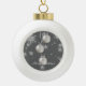 Decorate your Christmas tree this holiday season with a Silver Christmas Ornaments Ceramic Ball Ornament. Ornament design features a trio of hanging Christmas ornaments with falling snowflakes and a dark grey background. Additional gift and holiday items available with this design as well.