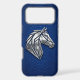 Gallop into luxury with this stunning iPhone 17 Pro Max case. Featuring a sleek, metallic silver geometric horse head in a sharp 3D chrome style, symbolising speed, freedom, and strength. The modern industrial art is set against a premium cobalt blue python snakeskin background for a sophisticated and high-end aesthetic. Perfect for equestrian lovers and those who appreciate futuristic minimalist wildlife art. A bold and elegant protective shield for your tech.