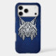 Capture the essence of stealth and sharp focus. This luxury iPhone 17 Pro Max case features a detailed metallic silver geometric lynx head with its iconic tufted ears in a 3D chrome style. The modern industrial art is set against a premium cobalt blue python snakeskin texture, offering a sophisticated and unique look for your tech.