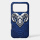 Experience the power of precision. This luxury iPhone 17 Pro Max case features a magnificent metallic silver geometric ram head with detailed spiralling horns in a 3D chrome style. The modern industrial aesthetic is perfectly set against a premium cobalt blue python snakeskin texture. A bold statement piece for those who value leadership, determination, and high-end minimalist art. Designed to provide a sophisticated and protective armour for your tech.