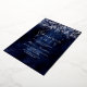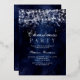 Silver confetti snowflakes navy blue watercolor Christmas party invitation, with real silver foil confetti, snowflakes and elegant navy blue watercolor with script font.