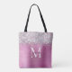 This chic tote bag features pink brushed metal background with sparkling silver Faux-Glitter border. Add your name and initial for a personal touch.