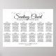This 12 table seating chart has seating assignments for 120 wedding reception guests. The black and white design is simple yet elegant with script lettering for the title and a vintage faux foil silver floral filigree border.