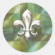 Silver Fleur de Lis on Abstract Greens Classic Round Sticker