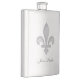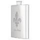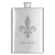 This Premium Flask features a large silver fleur-de-lis centred on the front. Personalise with your name in a flowing silver script. The Fleur-de-lys is an emblem or coat of arms of francophone origin. The motif here is silver on a metallic silver background but the background colour can be changed.