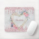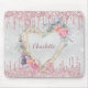 A faux silver metallic looking background. Blush pink faux glitter drips, paint dripping look as decoration. A golden heart decorated with pink flowers. Personalise and add a name. The name is written with a modern hand lettered script.