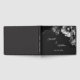 This elegant contemporary wedding guest book features silver flowers on a black background with bride and groom name and the wedding date.
