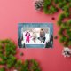 A simple photo Christmas card featuring a blue watercolor background accented with real silver foil pine and evergreen trees. The design offers a horizontal photo frame with the greeting "Warm Holiday Wishes".