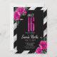 Celebrate in style with this unique Sweet Sixteen invitation template featuring a large, faux foil 'Sweet 16' in silver and hot pink. The solid black background is bordered with diagonal stripes in the same silver foil effect with lush pink roses in opposite corners. If preferred, the eye-catching 'Sweet 16' is optional and can be deleted to use this template for other occasions. Use the provided template to customise your event details. Search ID759 to see other products and colour options for this design.