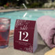 These beautiful table tent signs will make it easy for your guests to find their tables at your wedding reception. The elegant burgundy design features lacy script calligraphy with ornate silver grey floral curls and swirls in the corners. There is space for the names of the couple and the wedding date.