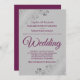 This simple yet elegant wedding invitation features magenta or cassis purple script lettering on a grey background. The design is understated, but the corners feature an ornate silver faux foil floral filigree with curls and frills. The text is formal and traditional but the chic design makes this invitation appropriate for any wedding.