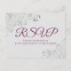 These beautiful RSVP postcards will make it easy for your guests to respond to your wedding invitation and indicate their choice of meals. The design is simple yet elegant with magenta or cassis purple coloured text and a lacy silver faux foil floral filigree border on light grey background.