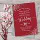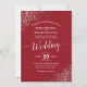This beautiful wedding invitation features a simple yet elegant design with lacy white script calligraphy on a red background and frilly silver grey faux foil filigree in the corners. The wording is formal, but the layout is modern and stylish.