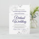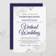 Just because you've been forced to move your wedding to a virtual ceremony, doesn't mean you can't send out beautiful invitations. This elegant invite features fancy navy blue and grey script lettering on a white background with lacy silver faux foil floral filigree or curls and swirls in the corners. Perfect way to invite your friends and family to share in your special day, even if they can't be there in person.