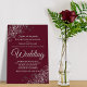 This simple yet elegant wedding invitation features gray script lettering on a wine red or burgundy background. The design is understated, but the corners feature an ornate silver faux foil floral filigree with curls and frills. The text is formal and traditional but the chic design makes this invitation appropriate for any wedding.