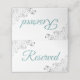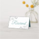 These elegant place cards are designed to let your guests know which seats are reserved for family and other special guests. They feature a white background with frilly ornate silver faux foil floral accents in the corners, and teal or turquoise lettering reading "reserved." Perfect for weddings or any other special occasion.